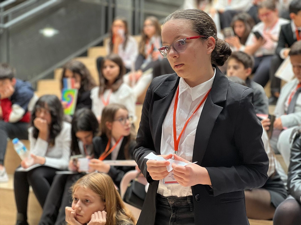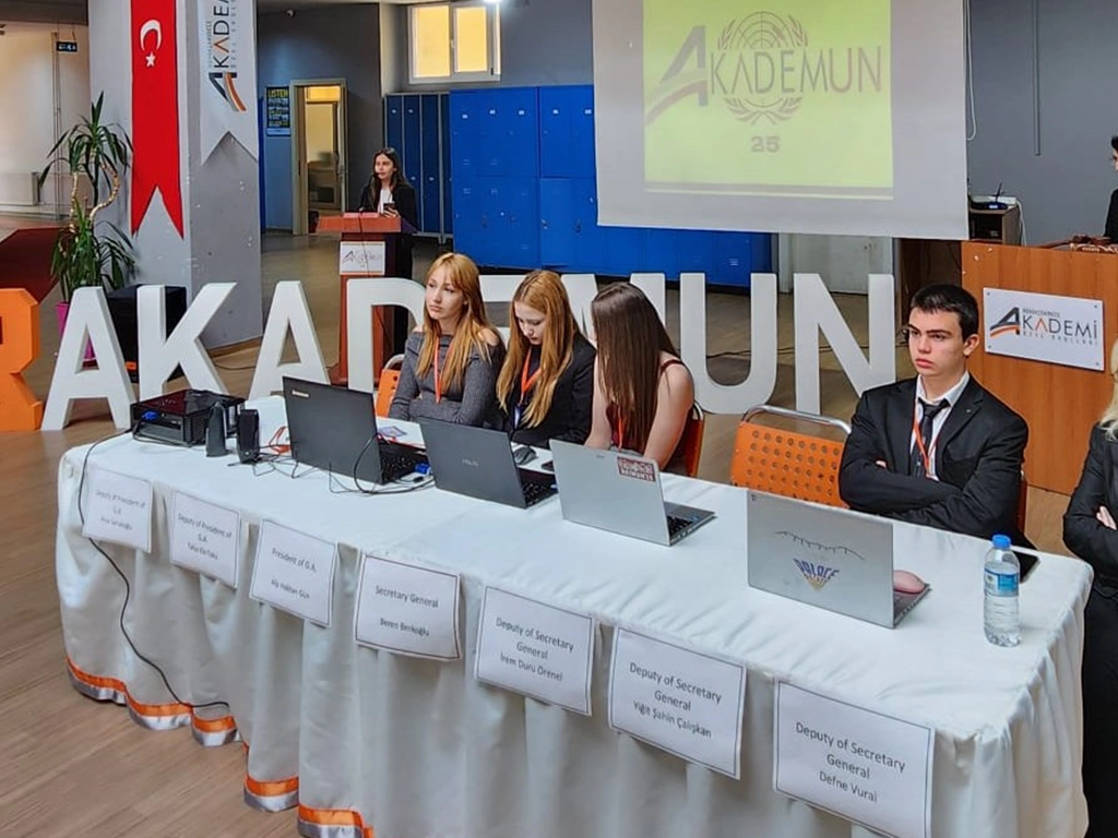Her yıl lise öğrencilerimizin mentörlüğünde ortaokul öğrencilerimizi Junior AKADEMUN – Ortaokul Model Birleşmiş Milletler Konferansı’na hazırlıyoruz. Bu süreç, sadece bilgi kazanımıyla sınırlı kalmıyor; öğrencilerimiz eleştirel düşünme, topluluk önünde konuşma, problem çözme ve küresel farkındalık gibi becerilerle donanıyorlar.
