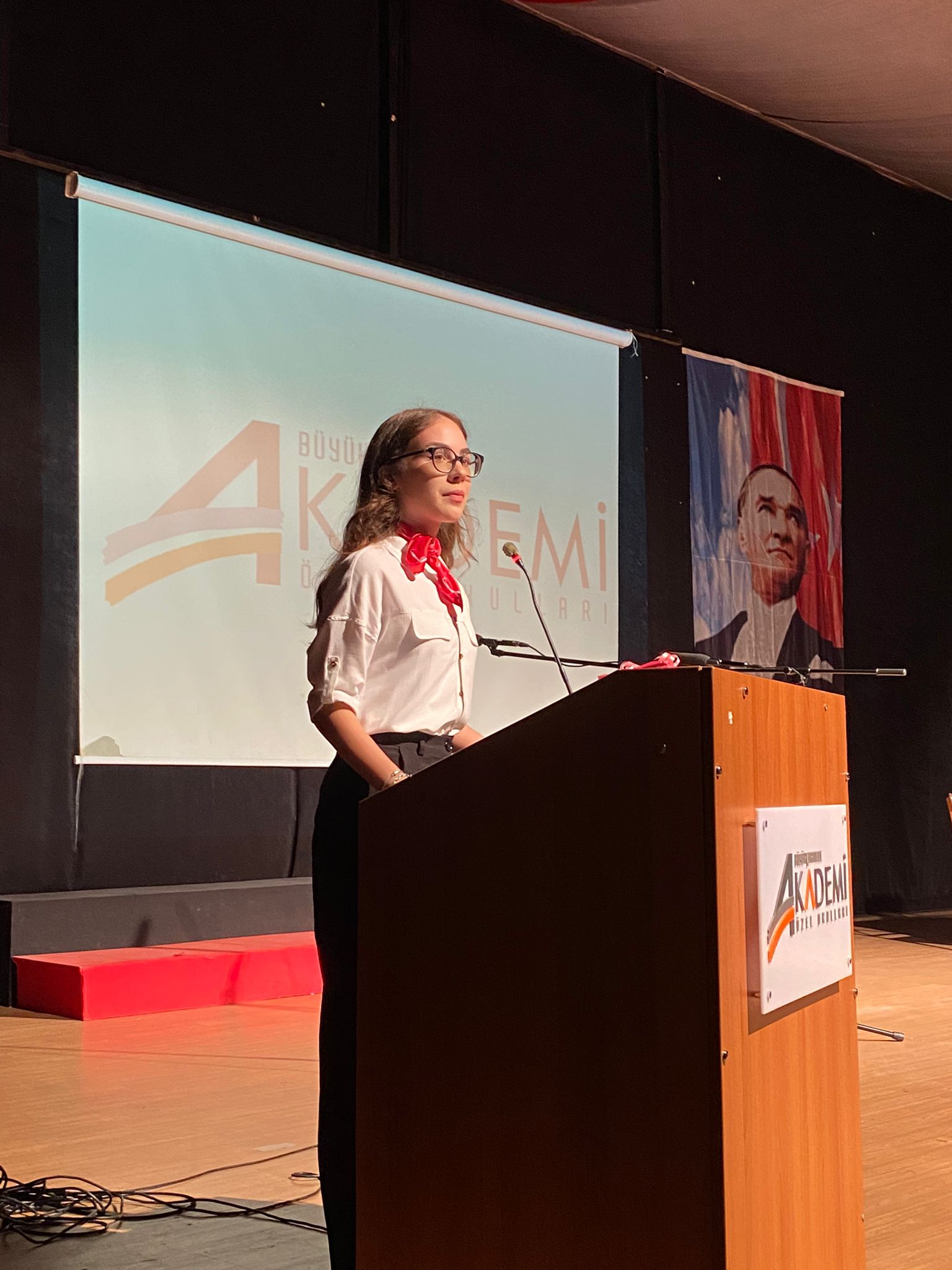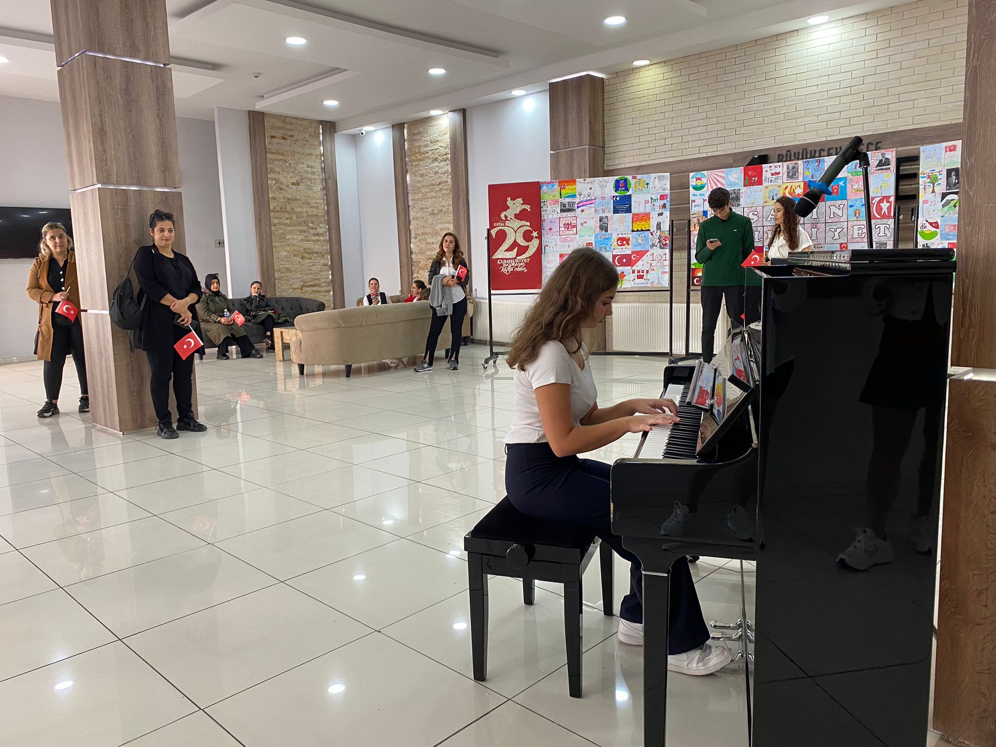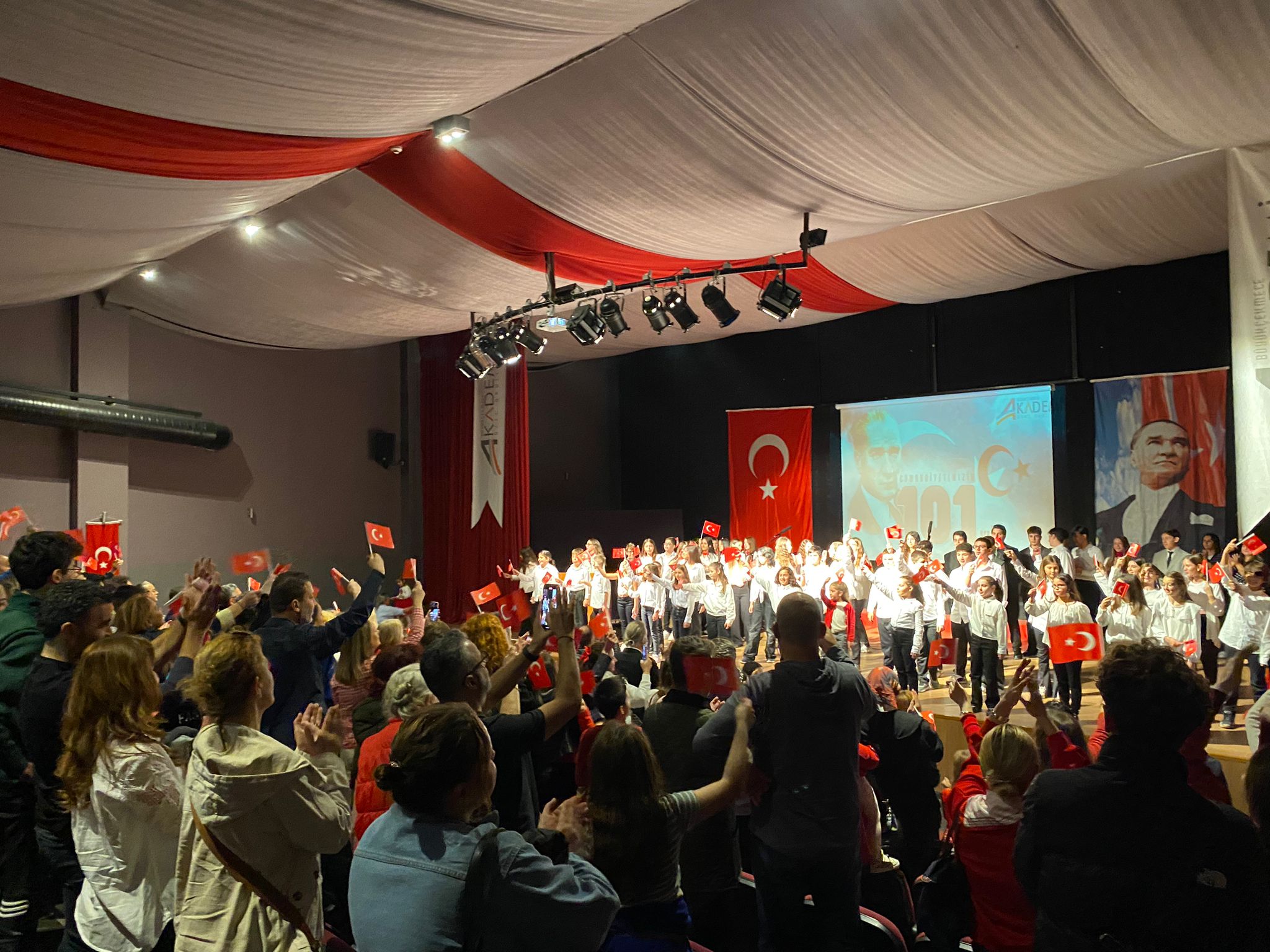 Okulumuzda 29 Ekim Cumhuriyet Bayramı töreni büyük bir coşkuyla gerçekleşti. Davetliler önce, okulumuzun lobisinde sergilenen resim sergisini öğrencilerimizin piyano resitalleri eşliğinde gezdiler. Konferans salonumuzda ise konuşmaların ve şiirlerin ardından Amasya Tamimi’ni konu alan “İLK ADIM” adlı dramayla, söz korosuyla ve okul müzik korosunun sunduğu şarkılarla bütünleşen tören, görkemli bir finalle sona erdi.